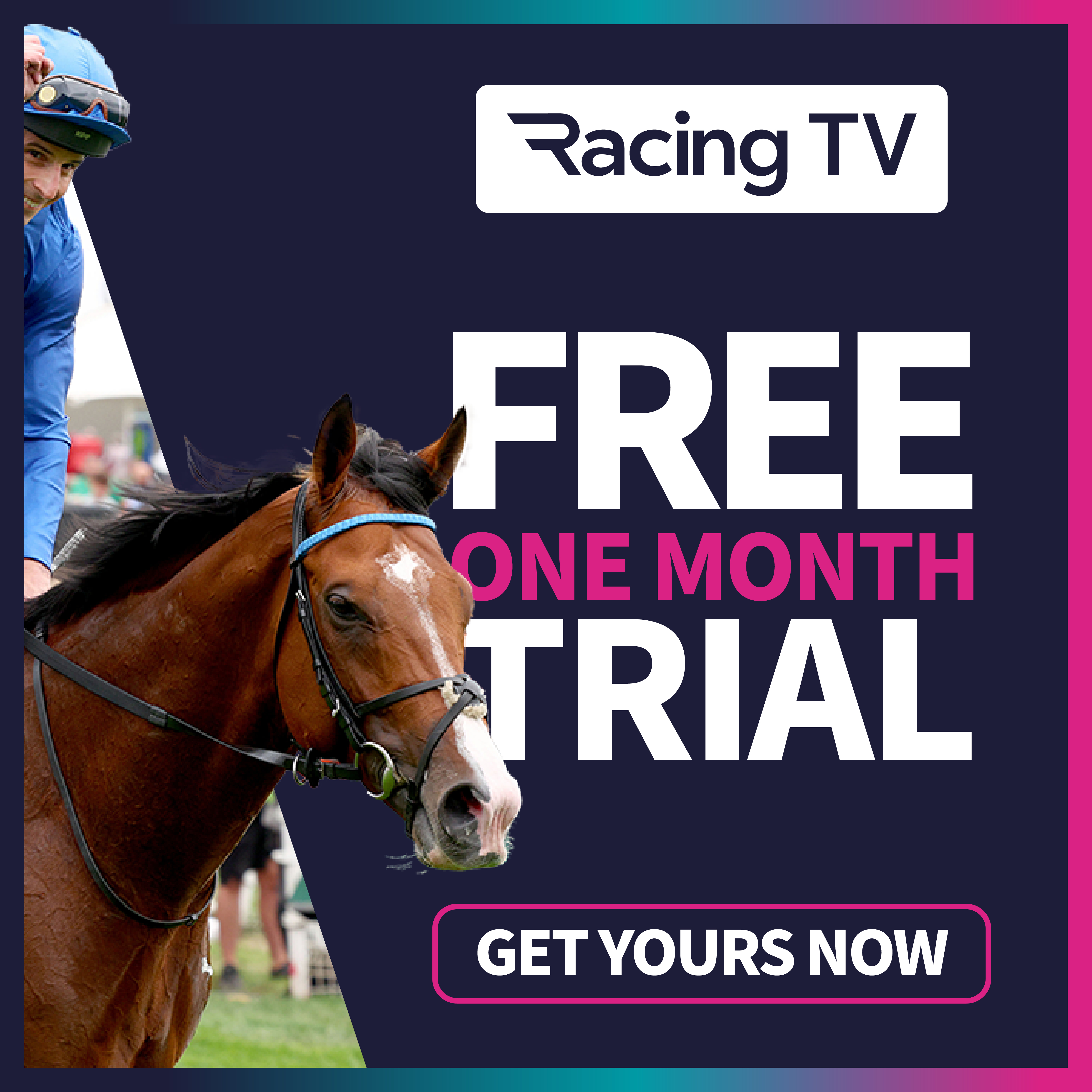 Sample the home of live British and Irish racing now! Start your free one month trial of Racing TV and enjoy up to 100 live meetings on TV, online and mobile.